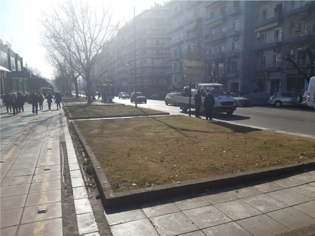 Στο πεζοδρόμιο που βρίσκεται επί της οδού Αγγελάκη, παραπλεύρως της ΔΕΘ υπάρχουν 30 παρτέρια.