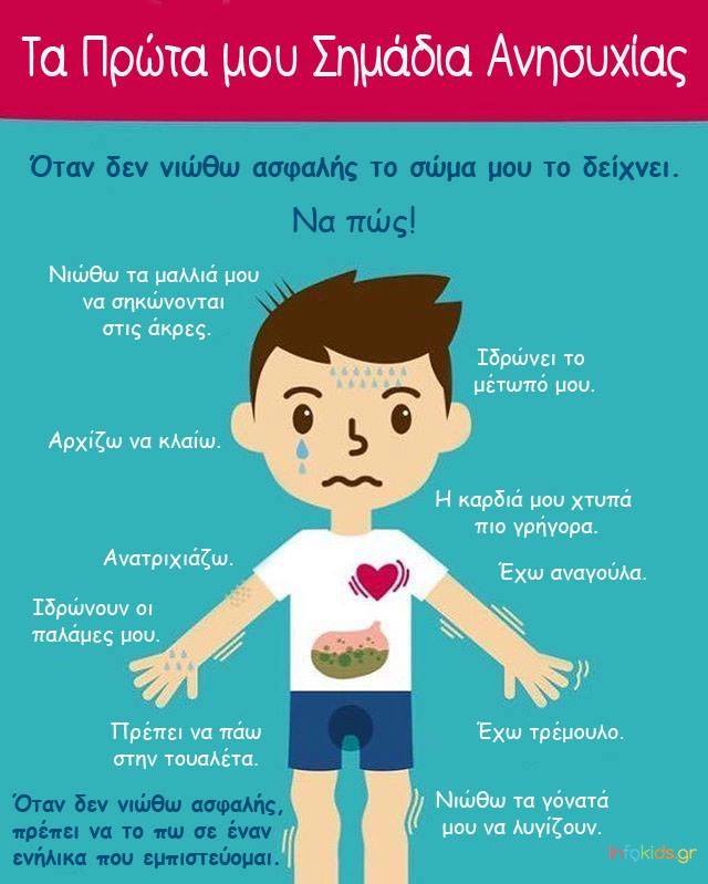 - Εξηγήστε στο παιδί ποια είναι τα πρώτα προειδοποιητικά συμπτώματα που στέλνει το σώμα, όταν βρίσκεται σε δυνητικά επικίνδυνες καταστάσεις ή όταν νιώθει άβολα. Δείτε στην εικόνα ποια είναι συνήθως αυτά: