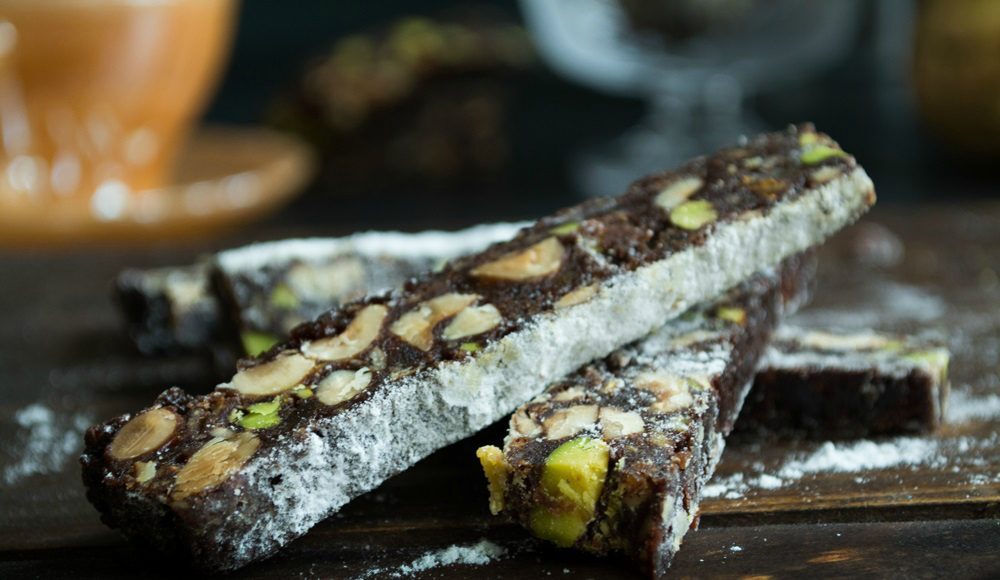 Υλικά ( χρόνος προετοιμασίας: 15 λεπτά )( χρόνος εκτέλεσης συνταγής: 1 ώρα & 20 λεπτά )( χρόνος αναμονής: 1 ώρα ) Υλικά ( για τη βάση )110 γραμ. χουρμάδες 110 γραμ. φιστίκια αλατισμένα 10 γραμ. κακάο1 κουτ. γλ. εκχύλισμα βανίλιας Υλικά ( για τη γέμιση )125 γραμ. σοκολάτα κουβερτούρα 150 γραμ. φυστικοβούτυρο150 γραμ. κρέμα καρύδας50 […]