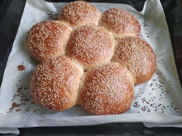 Υλικά ( χρόνος αναμονής: 20 λεπτά )( Χρόνος ψησίματος: 20 λεπτά )( Βαθμοί ψησίματος: 230 ) 2 κιλά αλεύρι πολυτελείας30 γραμ. αλάτι80 γραμ. ζάχαρη50 γραμ. μαγιά40 γραμ. γλουτένη800 γραμ. νερό200 γραμ. λάδιΣουσάμι ( για το πασπάλισμα ) Εκτέλεση 1) Σε μία μεγάλη λεκάνη ρίχνετε όλο το αλεύρι. 2) Ανοίγετε μία λακούβα στο κέντρο του αλευριού. […]
